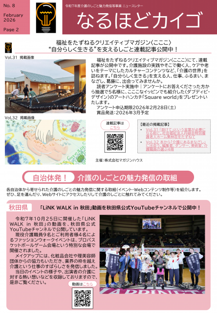 2月号では、「KAIGO LEADERS SCHOOL AWARD 2025~ケアの魅力、ここから広がる~」の開催情報や秋田県の介護のしごと魅力発信の取組についてなどの記事が掲載されています。