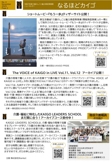 厚生労働省補助事業「介護のしごと魅力発信当事業」の一環で行われるイベントやWebサイト・動画コンテンツなどについて紹介するニュースレター(11月号)が発行されましたのでお知らせいたします。