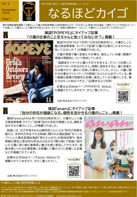雑誌『POPEYE』11月号(10月9日発売号)に、介護のしごと魅力発信等事業 タイアップ記事「介護の仕事のことをちゃんと知ってみないか?」が掲載されたことや、雑誌『anan』2466号(10月8日発売号)に、介護のしごと魅力発信等事業 タイアップ記事「自分の存在が価値になる。個性を活かせる介護のしごと。」が掲載されたことについての記事が掲載されています。