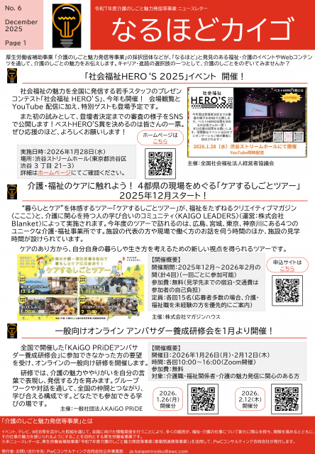 12月号では、「社会福祉HERO'S2025」イベント開催についてや介護・福祉のケアに触れよう!4都県の現場をめぐる「ケアするしごとツアー」2025年12月についてなどの記事が掲載されています。