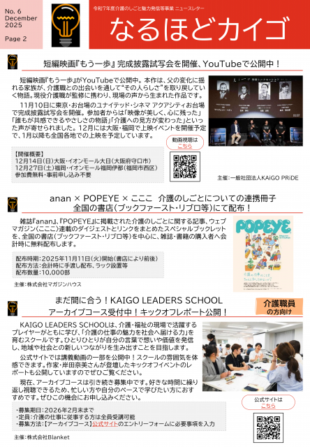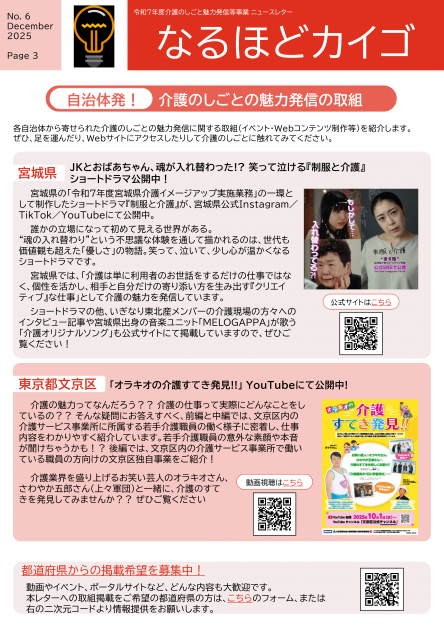 厚生労働省補助事業「介護のしごと魅力発信当事業」の一環で行われるイベントやWebサイト・動画コンテンツなどについて紹介するニュースレター(12月号)が発行されましたのでお知らせいたします。